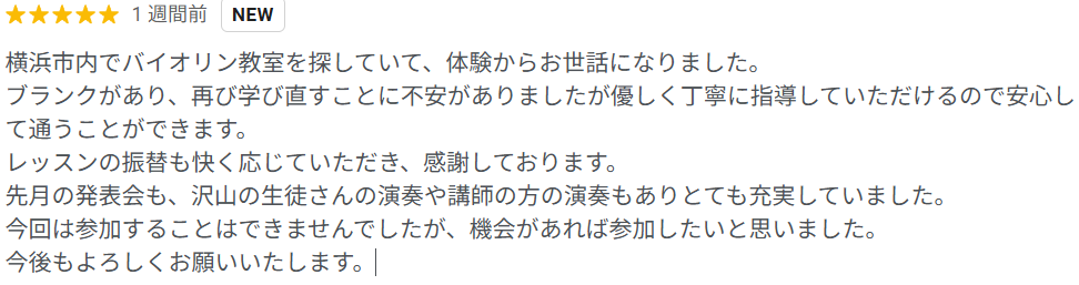当音楽教室にお通いいただいている生徒の皆様の声をご紹介します。▶Googleレビューより ▶第1回音楽発表会後のアンケートより(2024年9月) 当音楽教室にお通いいただいている生徒の皆様の声をご紹介します。 ▶Googleレビューより ▶第1回音楽発表会後のアンケートより(2024年9月) ヴァイオリンクラス・小学生ご兄弟 保護者の方 ヴァイオリンクラス・小学生ご姉妹 保護者の方 ヴァイオリンクラス・大人の方 ピアノ・ヴァイオリンクラス 小学生・未就学 ご姉弟 保護者の方 ピアノクラス・小学生お子さま 保護者の方 ピアノクラス・大人の方 フルートクラス・大人の方 ヴァイオリンクラス・小学生お子さま 保護者の方 ヴァイオリンクラス・中学生お子さま 随時、更新していきます。 体験レッスン(無料・30分)について 随時、更新していきます。 体験レッスン(無料・30分)について