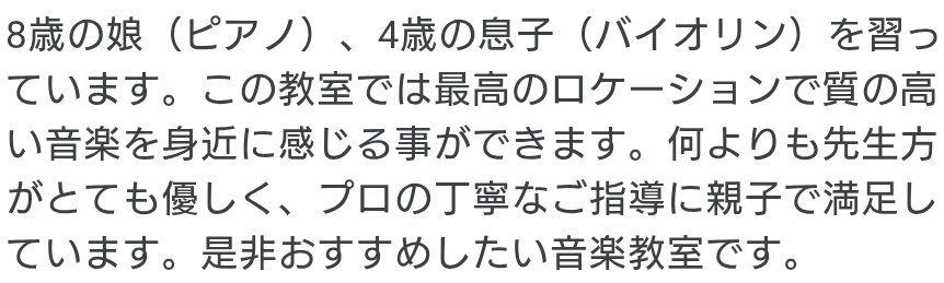 当音楽教室にお通いいただいている生徒の皆様の声をご紹介します。▶Googleレビューより ▶第1回音楽発表会後のアンケートより(2024年9月) 当音楽教室にお通いいただいている生徒の皆様の声をご紹介します。 ▶Googleレビューより ▶第1回音楽発表会後のアンケートより(2024年9月) ヴァイオリンクラス・小学生ご兄弟 保護者の方 ヴァイオリンクラス・小学生ご姉妹 保護者の方 ヴァイオリンクラス・大人の方 ピアノ・ヴァイオリンクラス 小学生・未就学 ご姉弟 保護者の方 ピアノクラス・小学生お子さま 保護者の方 ピアノクラス・大人の方 フルートクラス・大人の方 ヴァイオリンクラス・小学生お子さま 保護者の方 ヴァイオリンクラス・中学生お子さま 随時、更新していきます。 体験レッスン(無料)について 随時、更新していきます。 体験レッスン(無料)について